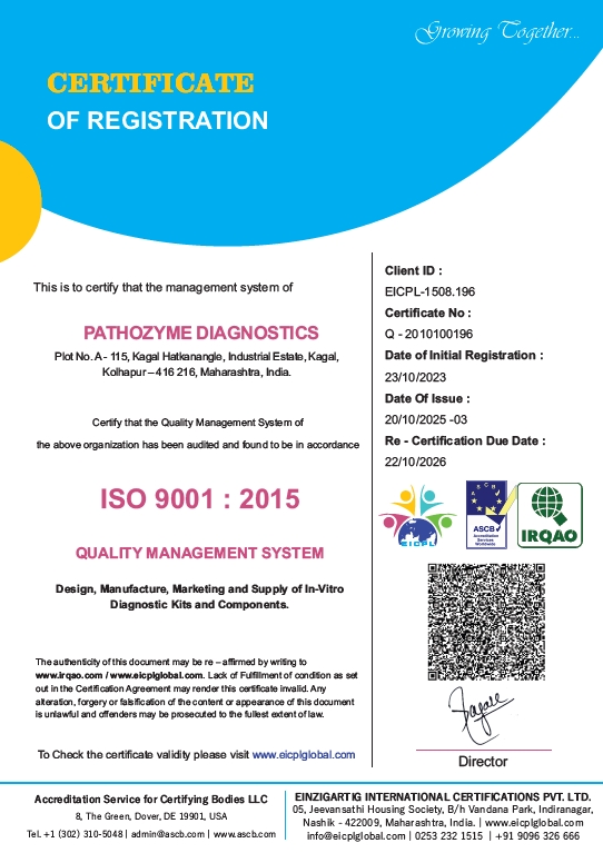 Established in 2006, Pathozyme Diagnostics is an India-based, international medical device company that is dedicated to the innovation, design and development of novel, clinically relevant and state-of-the-art devices. Pathozyme Diagnostics, a division of Oxalis Diagnostics (P) Ltd, is specialized in manufacturing and marketing of Clinical Chemistry, Serology Reagents, & Protein Immunoassay Reagents that are designed to perform as per international standards. As a leading healthcare solutions company, our fundamental aim is to victor the improvement of human suffering and improve quality of life.